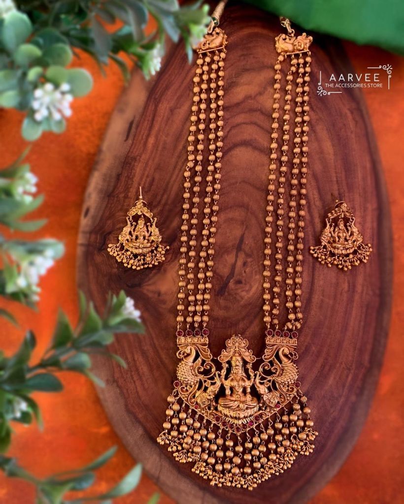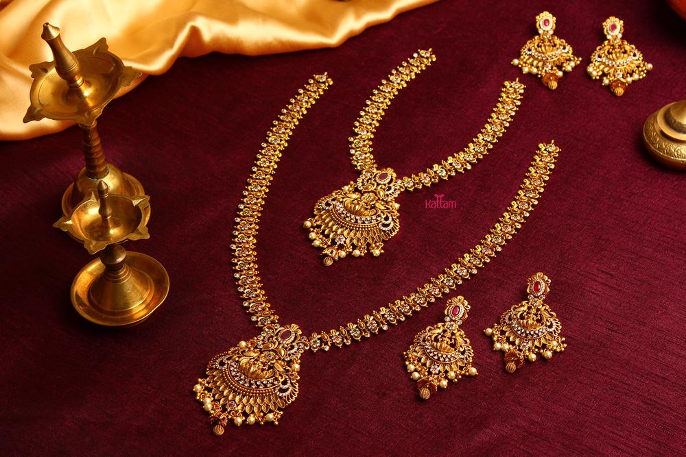 The main base is gold, although silver and other metals are also available and are inexpensive in comparison. Temple jewelry is embellished with precious and semi precious gems and pearls to give them a classic appearance. They are also embellished with Polki and Kundan stones, which are characteristic of North Indian jewelry. It comes in various designs and motifs such as swans, peacocks, lotus flower, gods and goddesses, royal figures etc. The range of jewelry starts from something as small as a nose ring to big chunky necklaces. Some pieces are worn occasionally like armlets, head adornments, anklets, waist belt and nose rings.